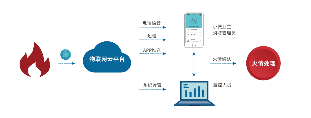 多途徑:平臺(tái)通過(guò)自動(dòng)語(yǔ)音、短信、APP推送等多種方式及時(shí)將火災(zāi)告警信息通知各類用戶和監(jiān)控人員。